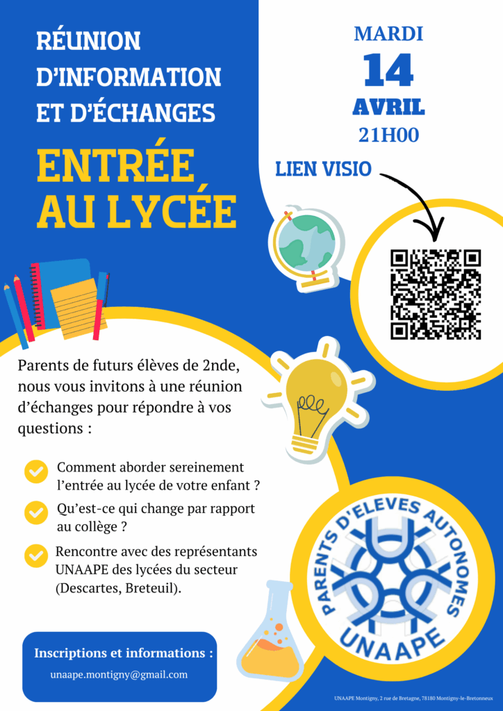 Nous vous invitons à une réunion d’échanges sur l’entrée en 2nd au Lycée. Vos représentants UNAAPE des lycées du secteur seront là pour répondre à vos questions :